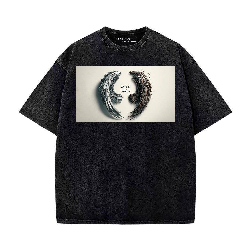 Embrace the balance of contrasts with the Dual Nature Tee. This elegant design features juxtaposed angel and demon wings, symbolizing the eternal struggle between good and evil. Crafted on soft, acid-washed 100% cotton, this tee offers both comfort and a statement style for those who dare to express the complexity of their persona. Perfect for a refined, yet bold wardrobe addition.
